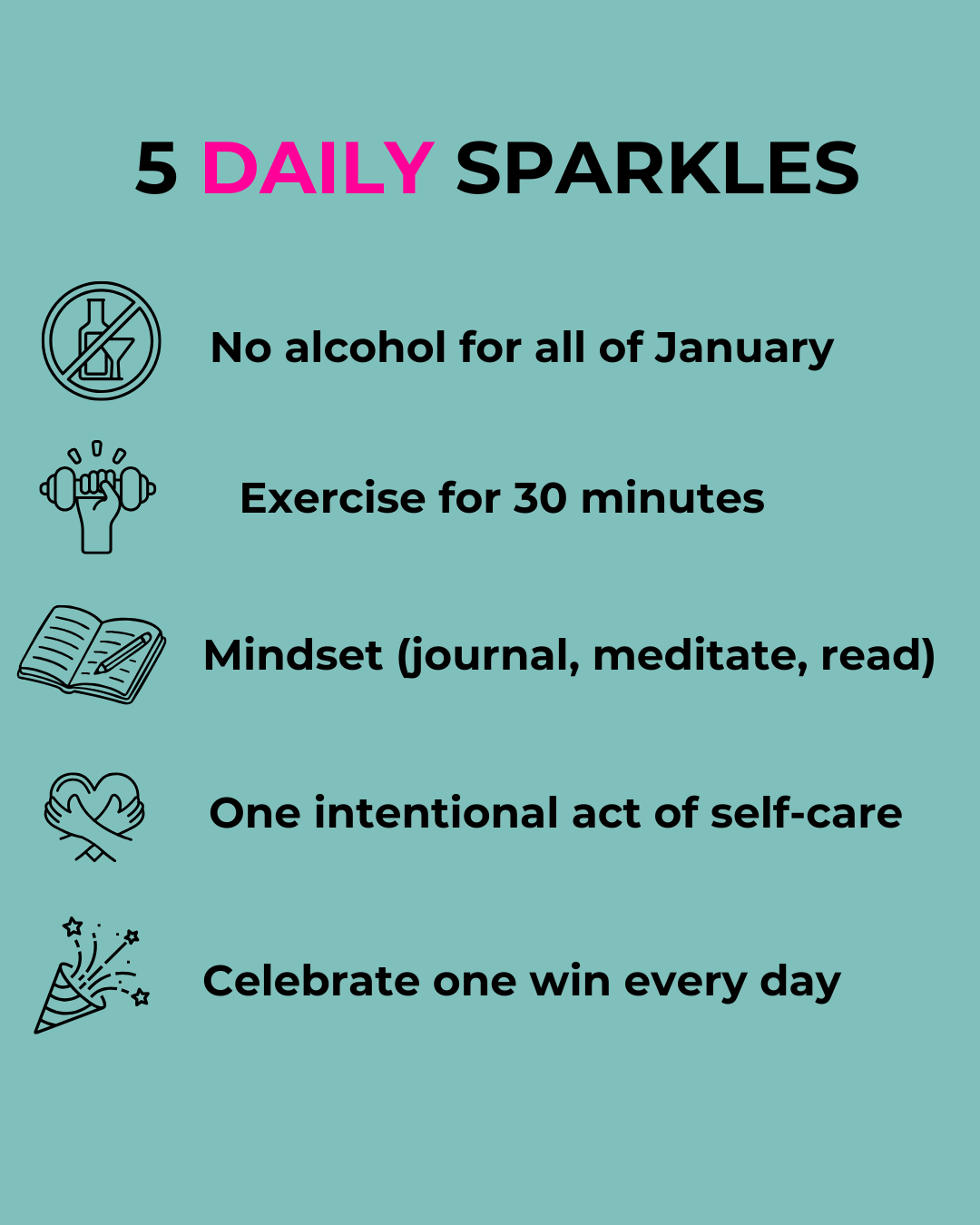 You get 5 weeks of guided support, habits, coaching, and community built around my signature 5 Daily Sparkles: